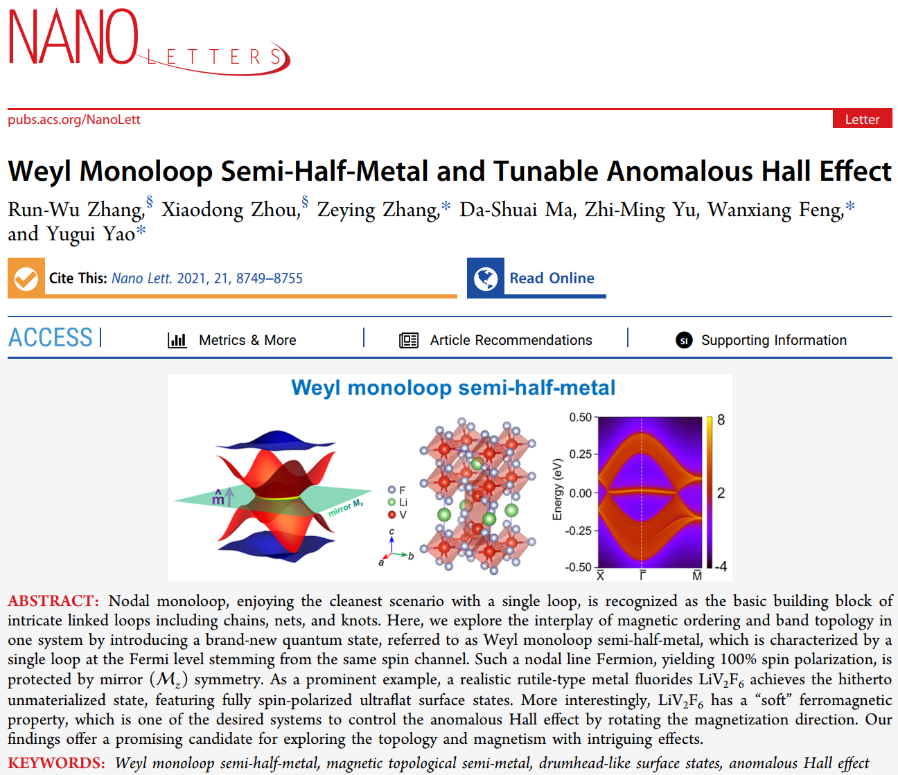 该工作得到国家自然科学基金委、科技部、中国博士后科学基金会等单位的支持。必威西汉姆联官网张闰午(博士后)、周小东(博士生)为该工作的共同第一作者,张泽英(2019届博士毕业生,现供职于北京化工大学)、冯万祥教授、姚裕贵教授为共同通讯。相关结果发表于国际顶级期刊Nano Letters(IF: 11.189):Run-Wu Zhang,† Xiaodong Zhou,† Zeying Zhang*, Da-Shuai Ma, Zhi-Ming Yu, Wanxiang Feng*, and Yugui Yao*; “Weyl Monoloop Semi-half-metal and Tunable Anomalous Hall Effect”, Nano Letters, 21, 8749-8755 (2021). (†为共同一作;*为共同通讯作者。)