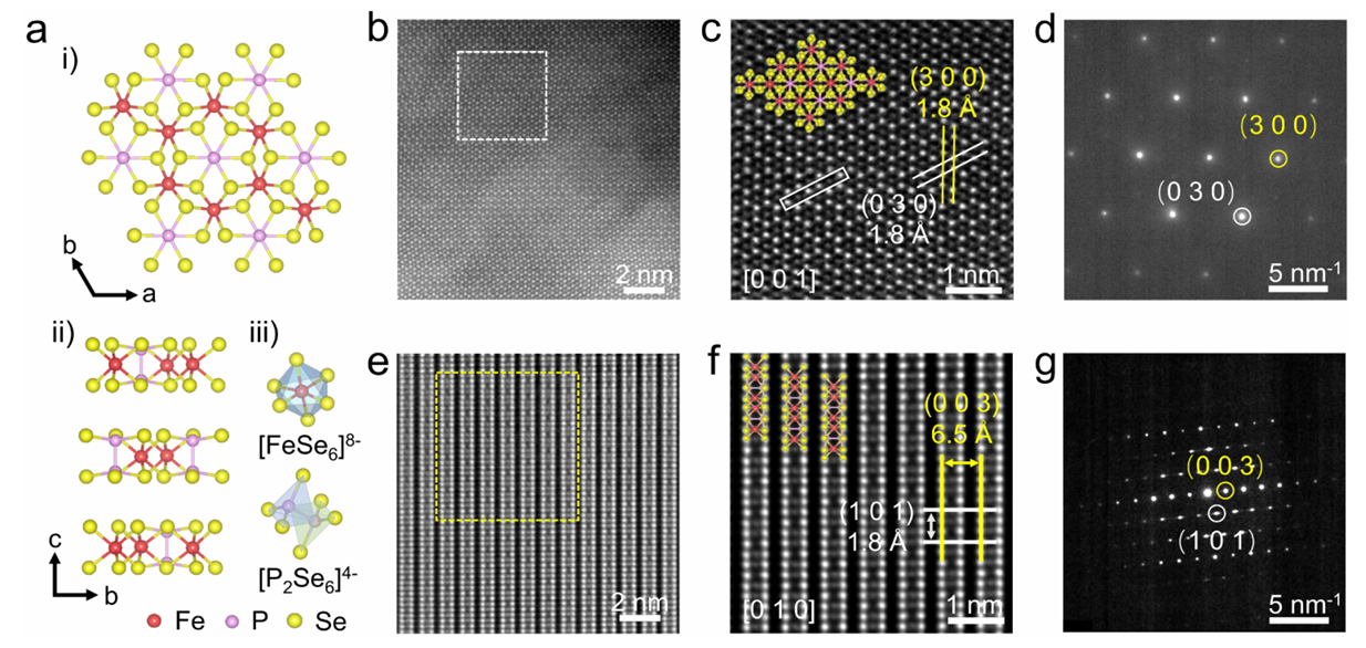 图2. FePSe₃的原子结构表征。(a) FePSe₃晶体结构示意图。(i) 单层FePSe₃俯视图。(ii) FePSe₃侧视图。(iii) 本征[FeSe₆]⁸⁻与[P₂Se₆]⁴⁻八面体结构示意图。(b) FePSe₃的原子分辨率HAADF-STEM图像。(c) 图(b)白色标记区域的对应HAADF-STEM图像,插图为FePSe₃对应的原子模型。(d) FePSe₃面内STEM图像对应的SAED衍射图谱。高度结晶化的结构显示出周期性原子排列且无任何空位缺陷。(e) FePSe₃的截面HAADF-STEM图像。(f) 图(e)黄色标记区域的对应HAADF-STEM图像,插图为对应的原子模型。(g) FePSe₃截面STEM图像对应的SAED衍射图谱。高度结晶化的结构显示出周期性原子排列且无任何空位缺陷。