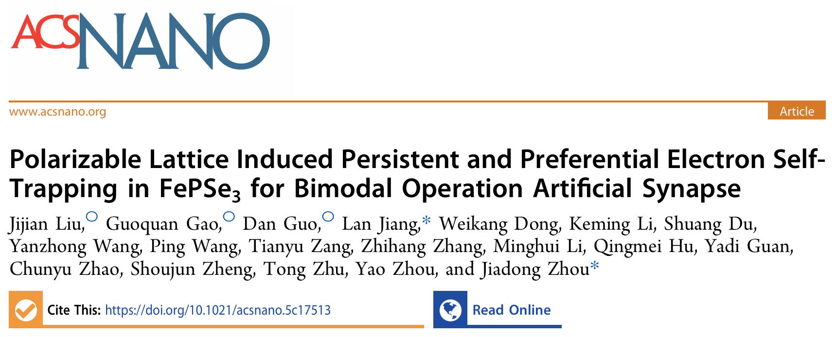 Jijian Liu, Guoquan Gao, Dan Guo, Lan Jiang, Weikang Dong, Keming Li, Shuang Du, Yanzhong Wang, Ping Wang, Tianyu Zang, Zhihang Zhang, Minghui Li, Qingmei Hu, Yadi Guan, Chunyu Zhao, Shoujun Zheng, Tong Zhu, Yao Zhou, and Jiadong Zhou,“Polarizable Lattice Induced Persistent and Preferential Electron Self-Trapping in FePSe₃ for Bimodal Operation Artificial Synapse” ACS Nano Article ASAP