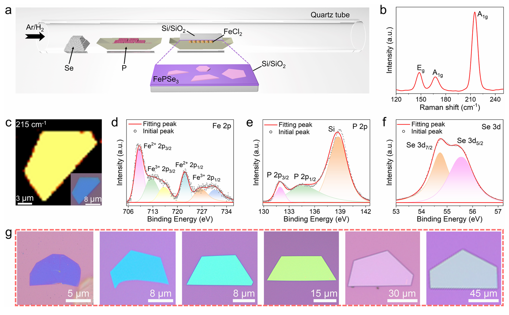 图1. FePSe₃的合成与表征。(a) FePSe₃的生长示意图。(b) FePSe₃的拉曼光谱。在148、167和215 cm⁻¹处分别观察到FePSe₃的拉曼特征峰。(c) 215 cm⁻¹处的拉曼强度映射图像及对应的光学显微镜图像(图1c内嵌插图)。(d−f) 分别为Fe 2p、P 2p和Se 3d轨道的XPS精细谱。其特征峰位与已报道结果一致。(g) 不同厚度FePSe₃在SiO₂/Si衬底上的光学显微镜图像。