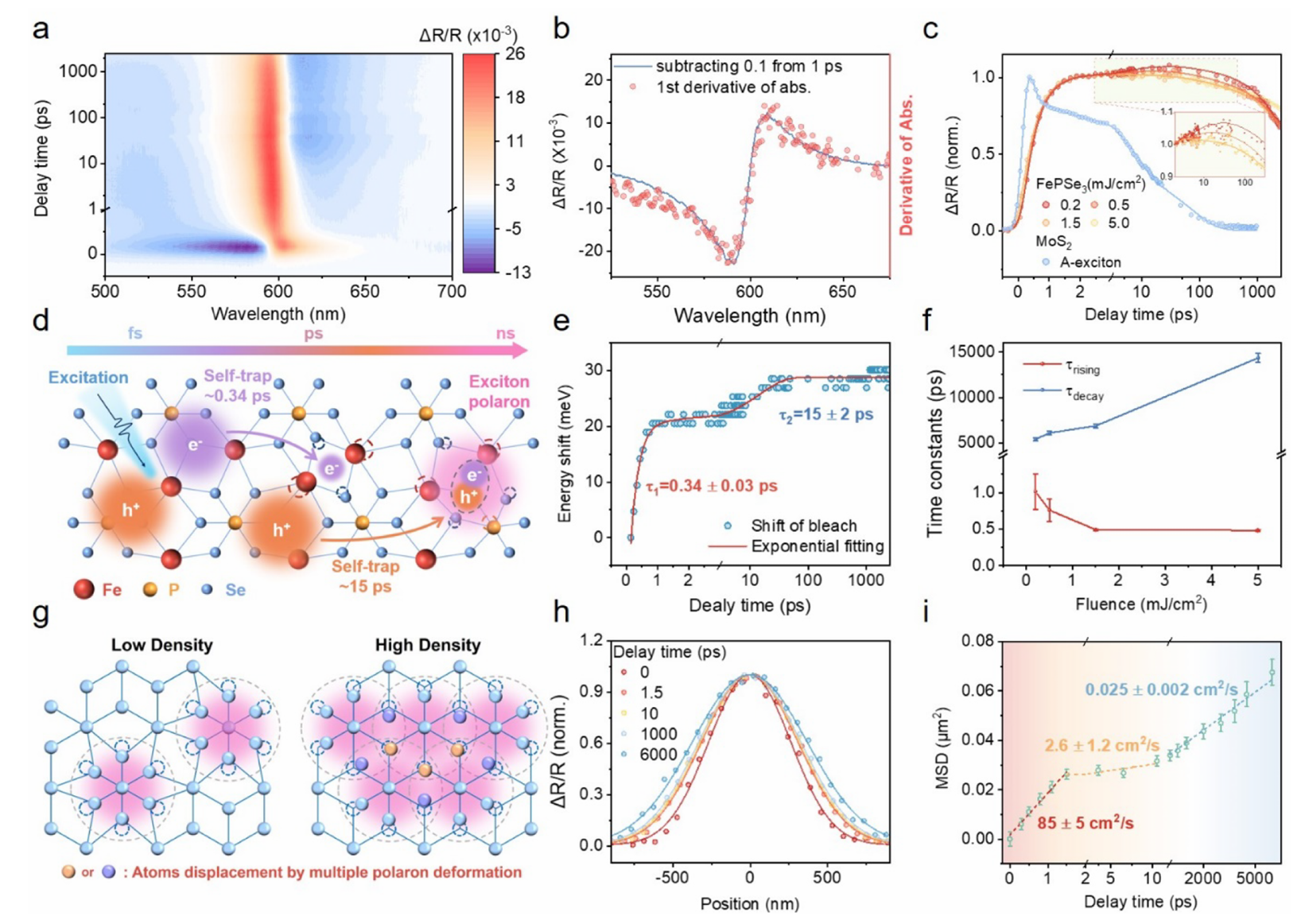 图3. FePSe₃中的异步极化子形成。(a) FePSe₃的二维瞬态吸收光谱随探测波长与延迟时间的变化关系。(b) 稳态反射光谱一阶导数与1 ps内瞬态响应信号的对比。(c) 基态漂白信号动力学及其功率依赖性(在时间延迟为2 ps处归一化),同时对比MoS₂的动力学以对比系统的仪器响应时间。(d) 异步极化子形成过程示意图。(e) 图(a)中基态漂白信号光谱位移的演化趋势,并通过双指数函数进行拟合。(f) 由图(c)提取的漂白信号动力学随激发通量的依赖关系。(g) 高激发密度下极化子形成过程中晶格畸变的竞争过程。 (h) FePSe₃中光生载流子空间分布随时间延迟的演化过程。(i) 载流子形成极化子的不同时间尺度过程中扩散常数的演化趋势。