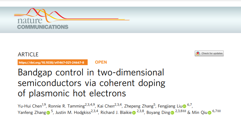 日前,必威西汉姆联张向东教授课题组青年教师陈宇辉研究员与新西兰维多利亚惠灵顿大学、奥塔哥大学,以及北京大学和西湖大学的研究者开展合作,在表面等离子体光学腔和二维半导体二硫化钨的复合体系上,通过利用光和物质强耦合效应,在实验上实现了对二硫化钨的高效热电子掺杂,大幅改变了二硫化钨原有的带隙,相关研究成果发表在国际顶级期刊《自然·通讯》上。