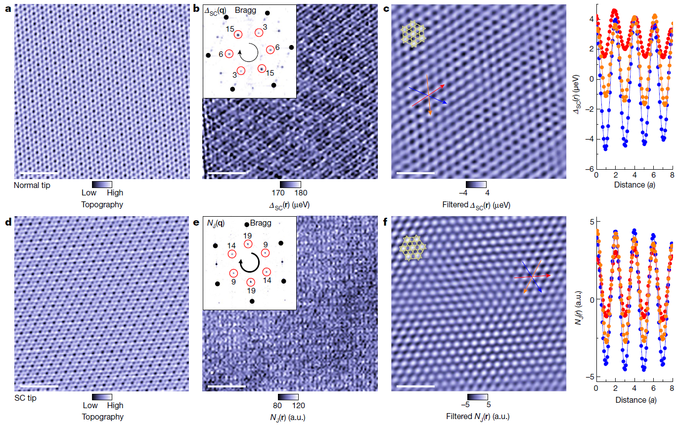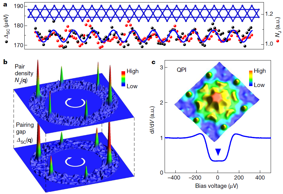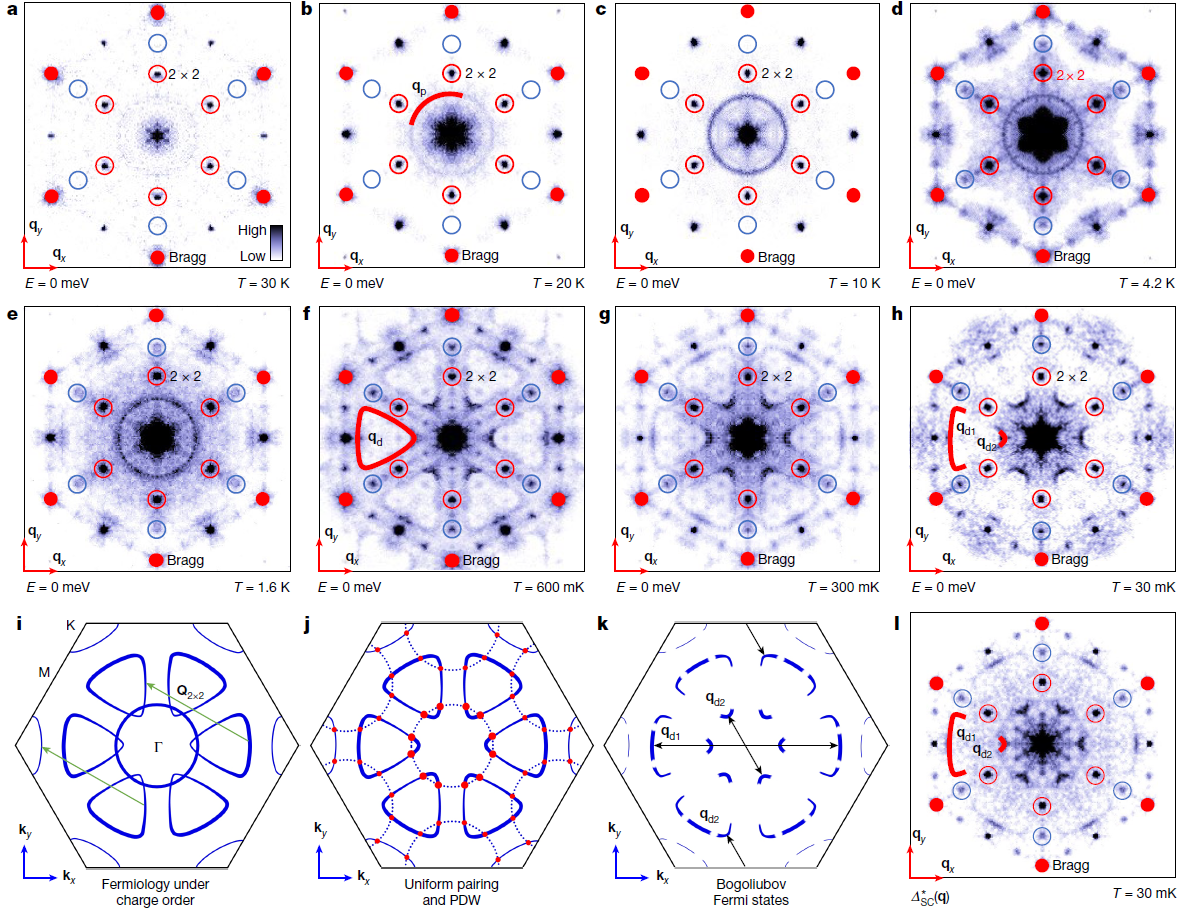早期理论研究表明,在具有配对密度波的体系中,超导能隙只在动量空间的部分费米面打开,体系中可以存在被称为Bogoliubov费米面的残留费米面,并与超导能隙振荡形成实空间-动量空间对应关系。鉴于此,他们进一步研究了不同温度下的准粒子散射,并观测到较高温度下信号主要来源于Sb-p轨道的散射;而随着温度的降低,这一信号逐渐被抑制,表明在p轨道上发生了空间均一的超导性。当进入超导态以后,观测到V-d轨道态的残留费米弧,作为潜在的Bogoliubov费米态,如图3所示。Sb-p轨道的超导和V-d轨道的2×2手性电荷振荡进行耦合,形成了一种特殊的p-d轨道交织的手性配对密度波;进一步的观测和分析最终为有限动量配对的磁性超导态提供了完整的证据链,如图4所示。