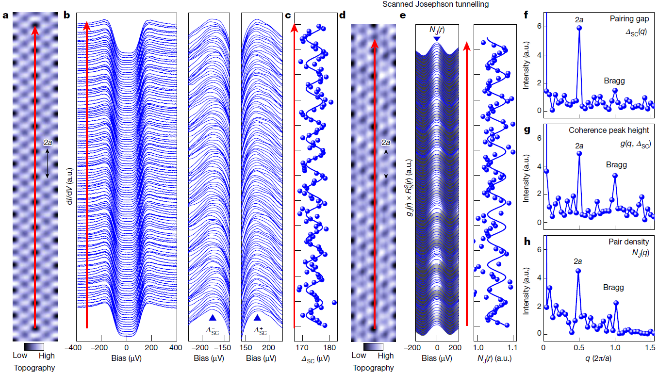 最近,该团队与合作者在AV3Sb5笼目超导体系中发现磁性超导态并发现该超导态可以随磁场调控。使用正常和约瑟夫森扫描隧道显微镜探测到KV3Sb5和CsV3Sb5中的手性超导能隙振荡,振荡周期为2×2,如图1所示;通过施加外磁场,可以调控超导能隙振荡的手性,表明了时间反演对称性破缺的手性配对密度波;进一步用超导针尖实现了超导约瑟夫森结来探测配对密度,并观测配对密度也具有2×2的手性振荡,如图2所示。
