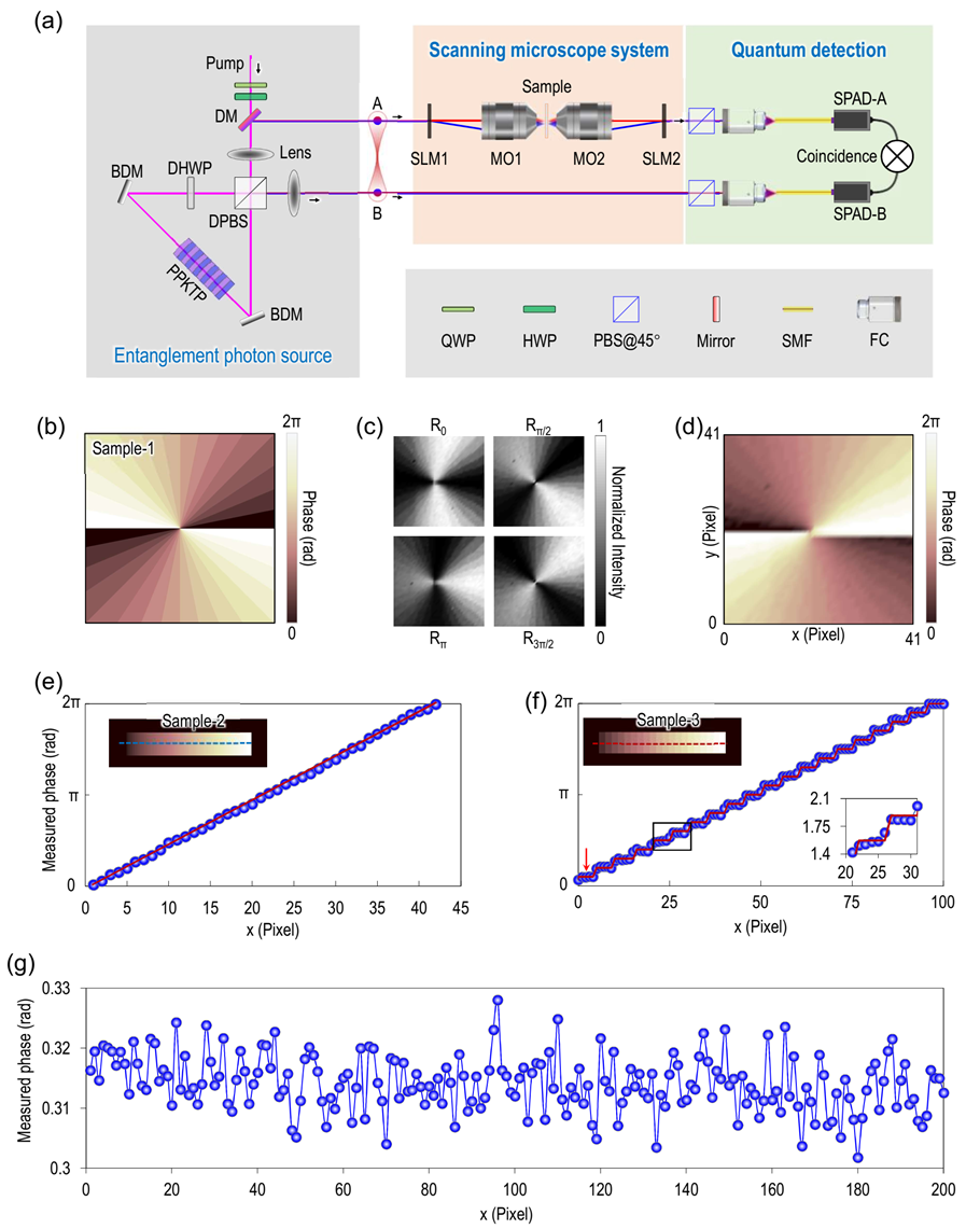 与经典光学显微技术相比,量子显微技术近年来受到了广泛关注,因为量子关联测量的使用可以有效减少环境噪声对系统的影响,提高其鲁棒性。此外,量子关联还可以用于提取每个光子的更多信息,从而提高光学显微镜的灵敏度。目前,基于量子关联的量子图像扫描显微镜已经在振幅型光学量子显微镜中实现了超分辨能力。然而,振幅量子显微镜无法测量透明物体。因此,研究量子相位显微镜受到了人们一些关注。基于NOON态,已经实现了偏振相位显微镜。这种量子显微镜主要用于双折射物体的定量相位测量,这极大地限制了它们的应用,特别是在生物样本检测方面。最近,利用偏振纠缠实现了一种光学空间差分量子暗场显微镜。然而,这种显微镜仅对相位物体的边缘敏感,属于定性相位测量。因此,开发新的量子相位显微技术以克服目前已有量子相位显微镜存在的问题是未来研究的目标。
