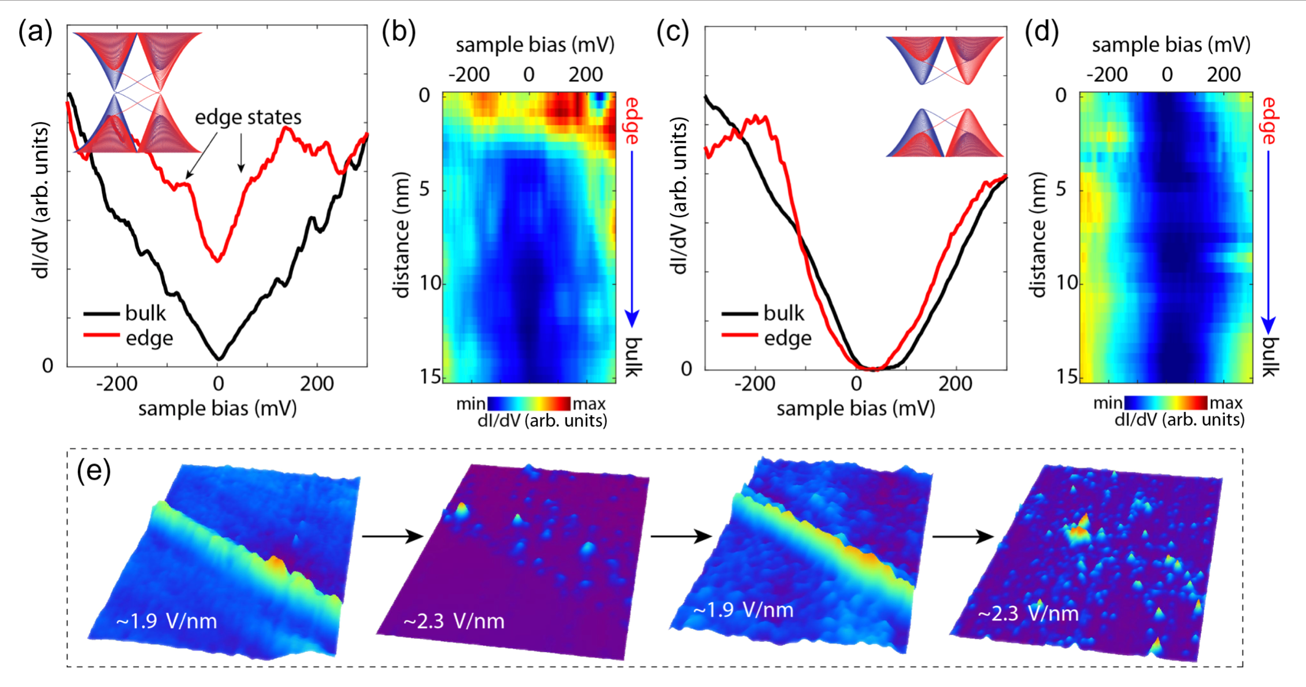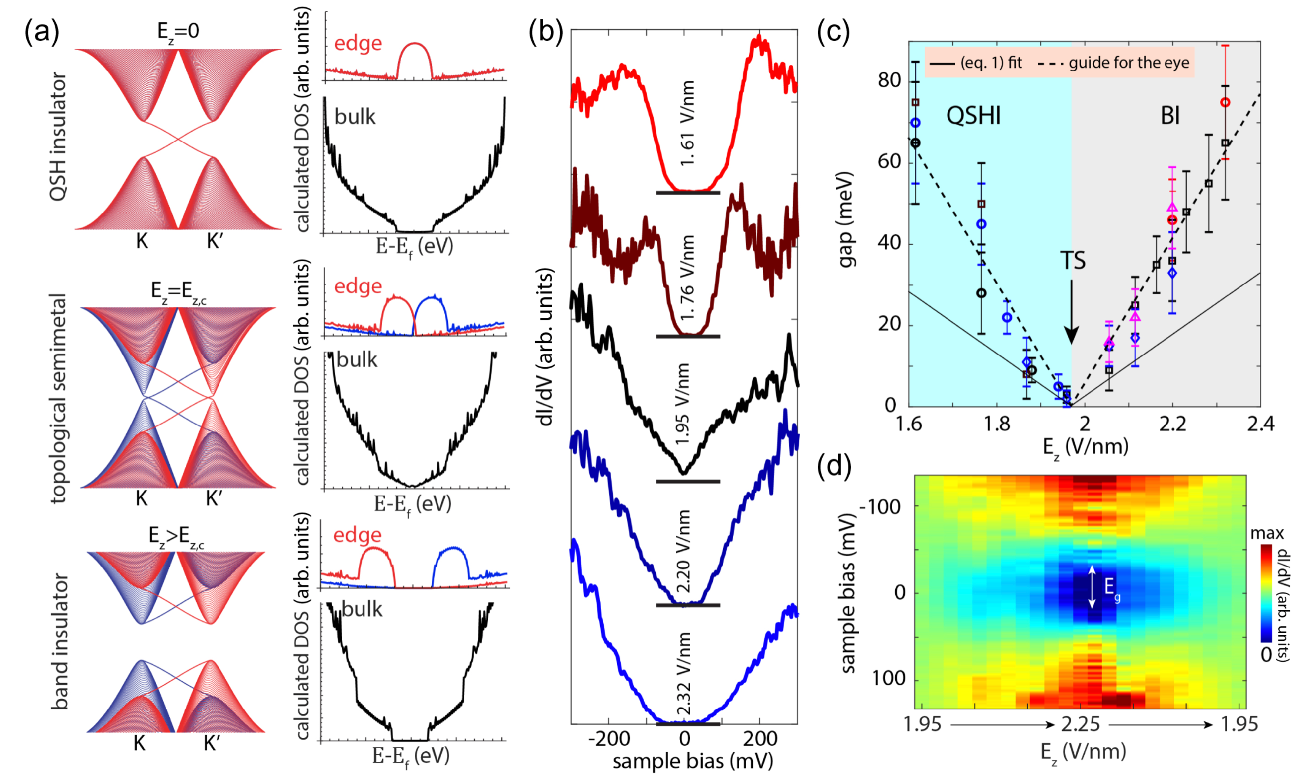 在该工作中,研究人员利用低温扫描隧道显微镜/扫描隧道谱、密度泛函理论和紧束缚计算来证明Ge2Pt(101)上的外延锗烯是一种具有起伏状蜂窝结构的量子自旋霍尔绝缘体。在其量子自旋霍尔效应状态下,锗烯的拓扑特征在于存在体能隙和金属性的拓扑边缘态【图1】。他们同时控制STM针尖到样品隧道结中的内置电场以改变锗烯的拓扑状态:在临界电场时,锗烯的拓扑能隙会闭合,体系转变为拓扑半金属;而当电场超过临界值时,锗烯会打开拓扑平庸的带隙,并伴随着拓扑边缘态的消失【图2、图3】。该工作给出了单元素量子自旋霍尔绝缘体中拓扑相变的第一个实验证据。这种由电场引起的拓扑状态切换和相当大的体能隙使锗烯成为室温拓扑晶体管的候选材料。