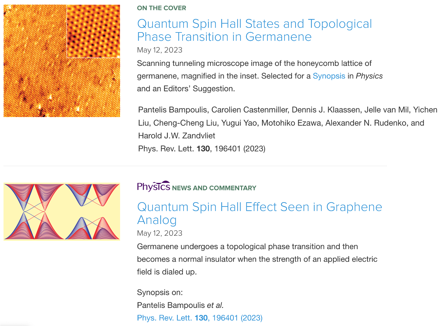 必威西汉姆联刘一辰博士生、刘铖铖教授和姚裕贵教授与合作者,包括荷兰特文特大学Pantelis Bampoulis、Harold J. W. Zandvliet教授及日本东京大学Motohiko Ezawa教授,实验观测到了锗烯中的量子自旋霍尔态及拓扑相变。该成果5月12日发表在国际知名期刊《物理评论快报》上,并被选为该期的封面文章(Cover)和编辑推荐(Editors' Suggestion),同时也被美国物理学会Physics网站专题评论报道。该工作证实了姚裕贵团队12年前的理论预言【Quantum Spin Hall Effect in Silicene and Two-Dimensional Germanium, Cheng-Cheng Liu, Wanxiang Feng and Yugui Yao, Phys. Rev. Lett. 107, 076802 (2011) SCI引用1894次;Low-energy effective Hamiltonian involving spin-orbit coupling in silicene and two-dimensional germanium and tin, Cheng-Cheng Liu, Hua Jiang and Yugui Yao, Phys. Rev. B 84, 195430 (2011) SCI引用988次】。