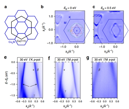 (a) 蓝色表示CuSi2布里渊区,黑色表示Cu(111)表面布里渊区;(b)(c)ARPES测量费米面处和费米以下0.5eV处等能面图; (e)(f)(g) ARPES测量沿着高对称路径的能谱密度图