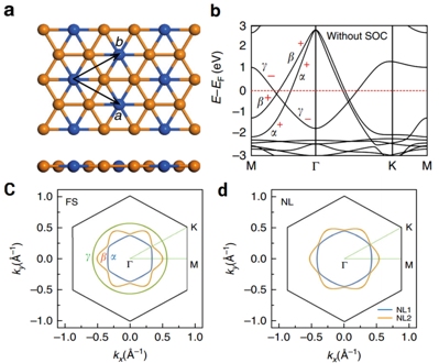 在该工作中,他们通过理论上第一性原理计算和实验上角分辨光电子谱测量证实了单层的Cu2Si体系是一种二维节线半金属。发现在费米能级附近,体系的一条导带和两条价带相交,在布里渊区中间区域形成两套封闭的节线。两套节线分别呈现六边形和六角梅花形。进一步通过对称性分析揭示了发现这种节线半金属受到垂直方向的镜面对称性保护。如果破坏体系对称性,原本无能隙的节线会打开能隙。但是在一些高对称方向依然有能隙闭点,形成类似于石墨烯体系中的狄拉克点。实验上Cu2Si生长在Cu单质的(111)表面,通过角分辨光电子谱测量他们发现沿着不同的方向上都有能隙闭合点,即证明了节线半金属的存在。该结果把节线半金属从三维推广到了二维。此外,他们还建议可以通过施加不同衬底破坏对称性,实现从二维节线半金属到二维狄拉克半金属转变。这些结果也为将来为实现纳米尺度的新型拓扑量子器件提供了一种新材料上可能。