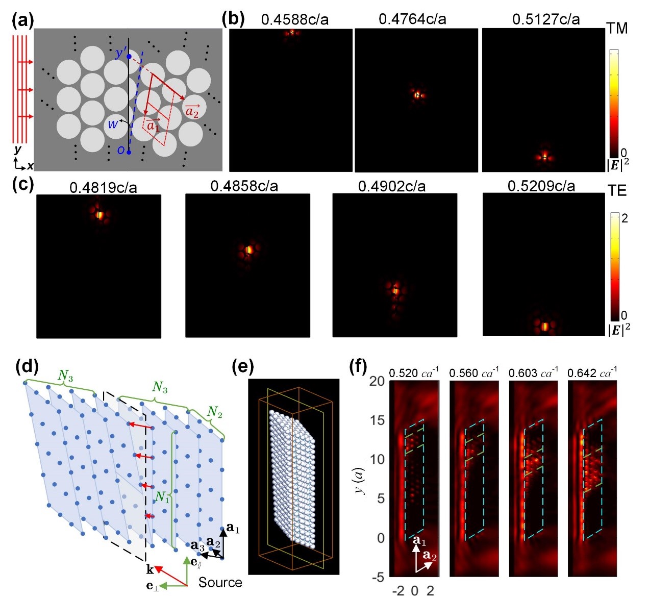 图3 光子晶体晶格旋转实现的拓扑彩虹,不同频率的拓扑态囚禁在芯片上不同位置(a-c);空间合成维度光子晶体拓扑彩虹,不同频率的拓扑态囚禁在空间不同位置(d-f)。