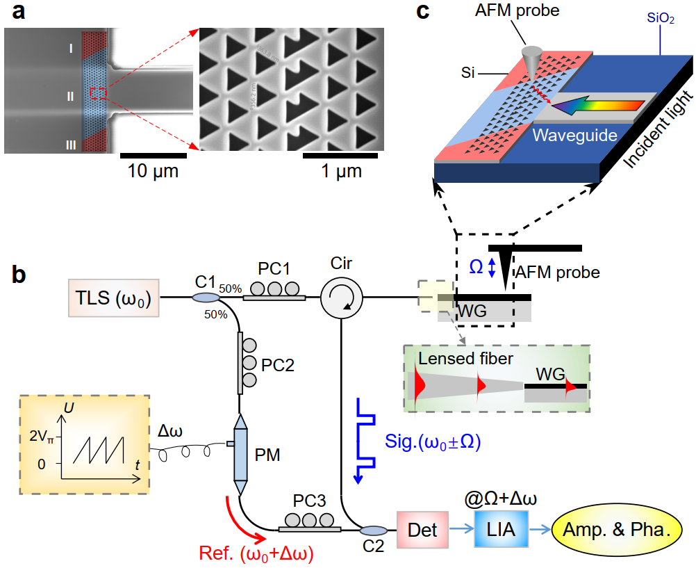 图1 (a)样品电镜图;(b)样品测试示意图;(c)散射式近场光学显微镜实验装置图。