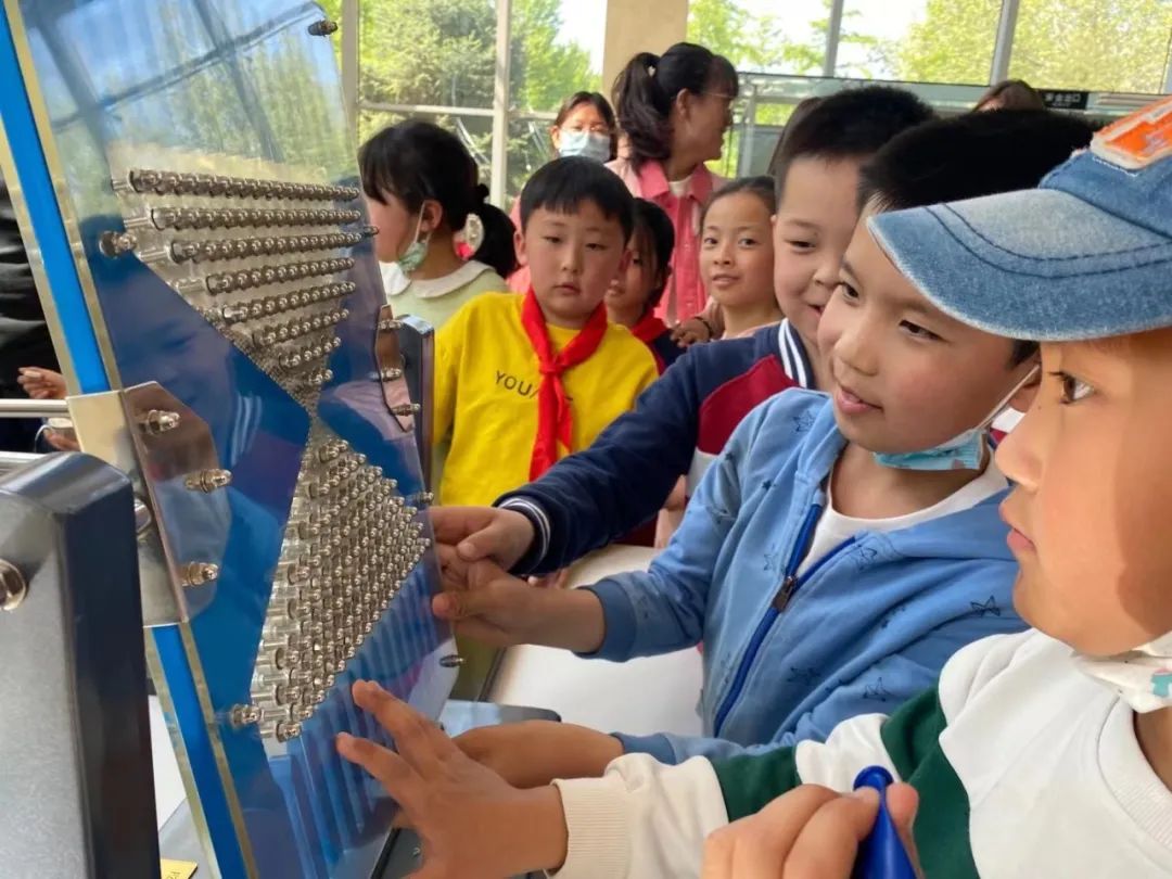 小朋友在必威西汉姆联科普活动中体验伽尔顿板实验和视觉魔球实验