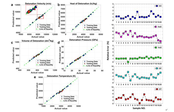 图4. (左)模型预测图:(a)爆速;(b)爆热;(c)爆容;(d)爆压;(e)爆温(右)随机盲测结果