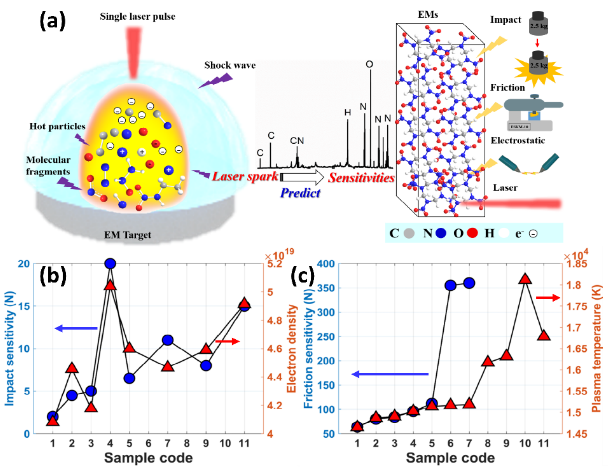 图5. 激光等离子体与感度关联性分析图:(a)基于激光等离子体光谱的感度预测机理;(b)电子密度和撞击感度关联图;(c)等离子体温度和摩擦感度关联图;