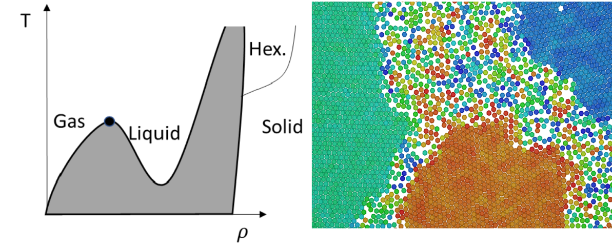 二维Lennard-Jones (LJ) 体系相图 (左),六边形体系低温下固-液共存构型 (右)