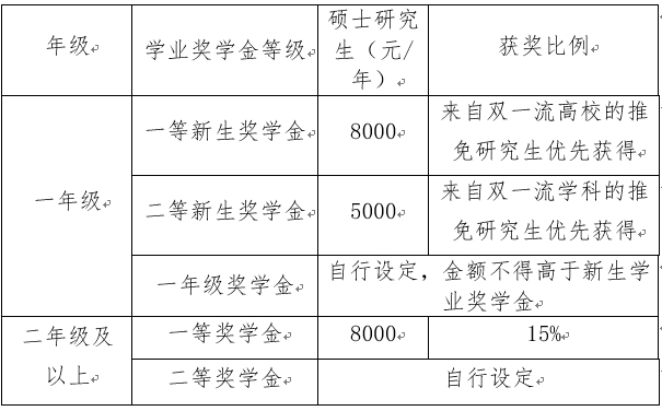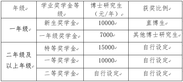 研究生学业奖学金的等级设定与金额标准如下表所示: