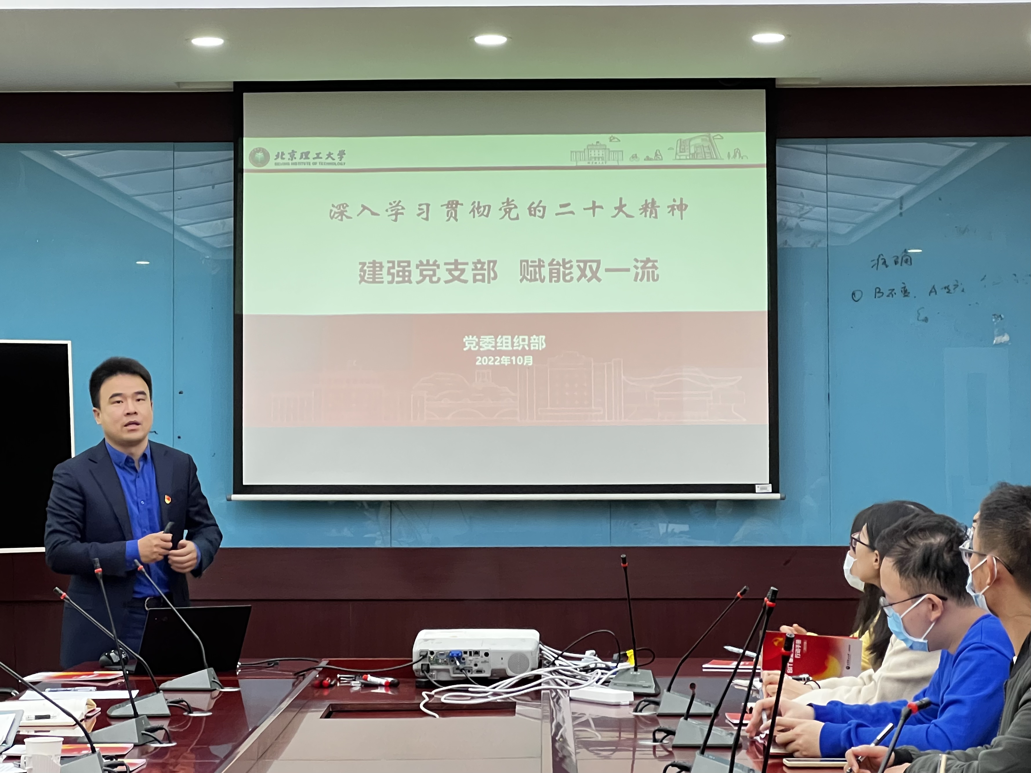 为贯彻落实以习近平同志为核心的党中央关于加强基层组织建设的重要指示精神,赋能基层党组织,进一步筑牢基层党组织“战斗堡垒”,10月19日,北理工党委组织部部长李德煌在良乡校区物理实验中心为必威西汉姆联师生党支部书记讲了一堂题为《深入学习贯彻党的二十大精神 建强党支部 赋能双一流》的党课。学院党委书记姜艳,副书记、副院长王晶晶和师生党支部20名支部委员到场听课。