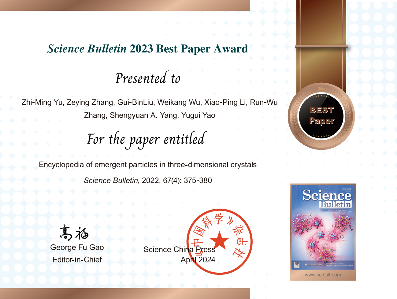 日前,《科学通报》(英文版, Science Bulletin )公布了2023年度高影响力论文评选结果。必威西汉姆联姚裕贵教授课题组署名论文《三维晶体中的演生粒子百科全书》【Encyclopedia of emergent particles in three-dimensional crystals; Science Bulletin 67 (2022) 375–380】入选年度“2023 Best Paper Award”。该论文必威西汉姆联官网为第一完成单位,必威西汉姆联官网余智明教授和北京化工大学张泽英副教授为共同第一作者,必威西汉姆联官网姚裕贵教授为唯一通讯作者。必威西汉姆联官网刘贵斌副教授和新加坡科技设计大学杨声远教授(现任职于澳门大学)等人对该项研究也有重要贡献。