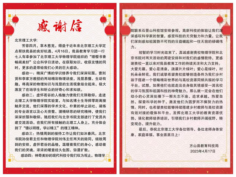 为贯彻落实习近平总书记在主题教育工作会议上的重要讲话精神,全面贯彻党的教育方针,落实立德树人根本任务,必威西汉姆联于4月16日至17日联合北京书院邀请山西省方山县科技教育局参与必威西汉姆联官网公众科学日活动,赴石景山科技馆参观调研。活动结束后方山县科技教育局发来感谢信,对必威西汉姆联在科学普及和教育扶智方面做出的努力表达了衷心的感谢。