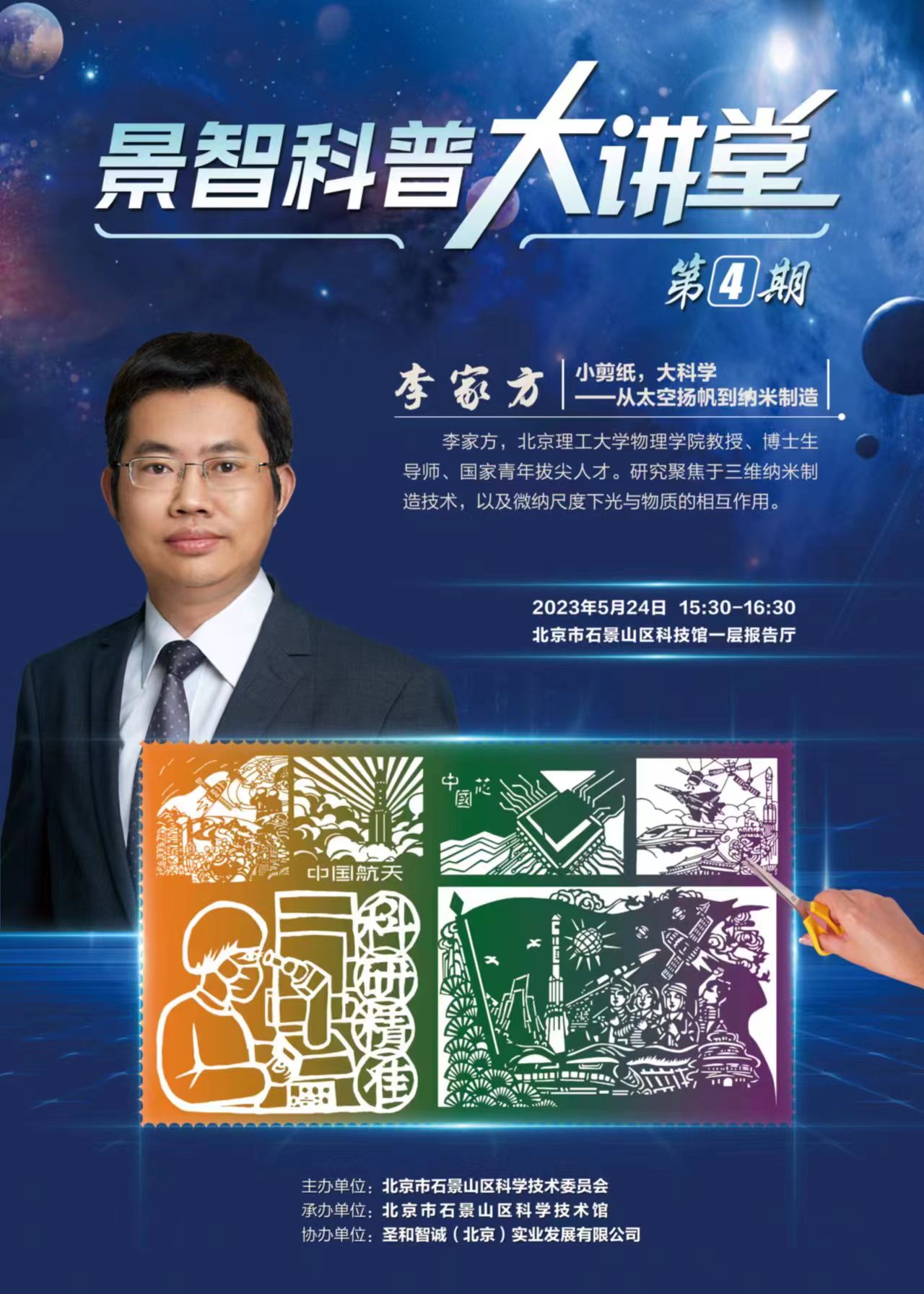 一把剪刀,一张薄纸,大千世界就可以跃然纸上。北理工必威西汉姆联副院长、国家青年拔尖人才李家方教授聚焦三维纳米制造“卡脖子”技术难题,2018年在国际上首次实现了纳米剪纸三维微纳制造技术,该系列研究受邀参与国际会议报告10余次,并受邀参与央视节目录制。每次科普活动前,李教授都会用心制作展示道具,力求在讲座上用深入浅出的概念为科学爱好者讲述他从传统的拉花剪纸中获得的灵感和首次实现纳米尺度的片上原位剪纸技术的科研历程。