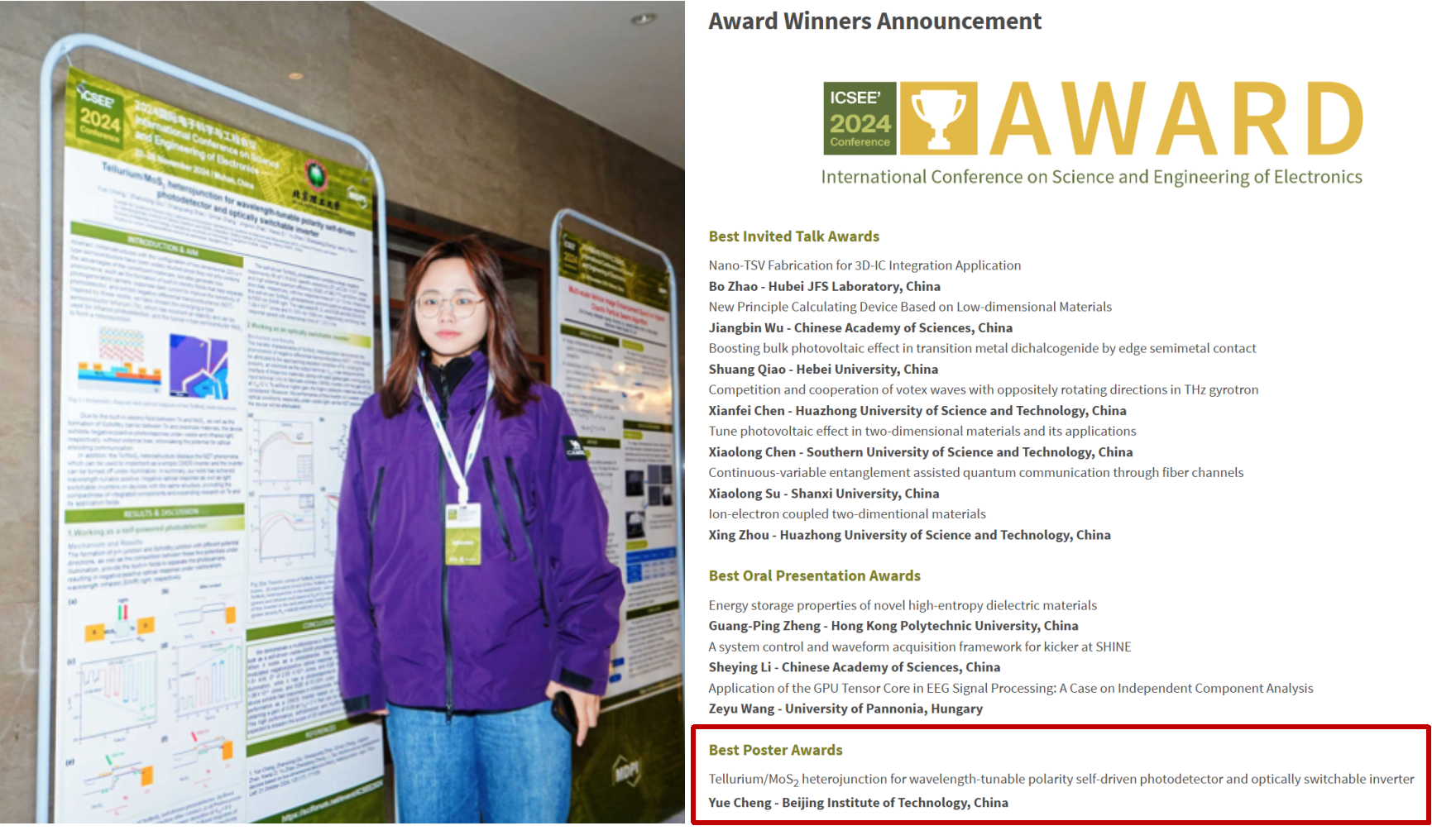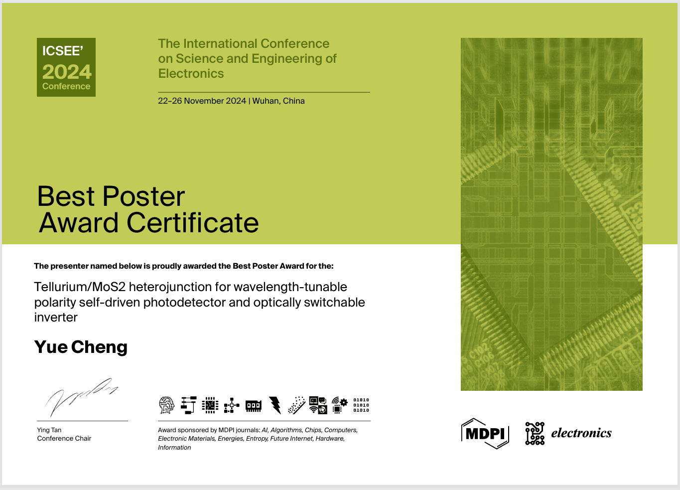 必威西汉姆联陶立教授课题组博士研究生程悦参加本次大会并进行了学术海报展示,题目为:“Tellurium/MoS2 heterojunction for wavelength-tunable polarity self-driven photodetector and optically switchable inverter”。该海报受到组织委员会、与会同行学者和国内外专家的一致好评,荣获该会议唯一Best Poster Award(最佳海报论文奖)。该工作利用能带工程,选择新兴的高空穴迁移率二维红外半导体碲单质材料,与二硫化钼构建异质结,在单个光电子器件上实现了波长调控的光响应极性以及光照可切换的反相器功能,促进了集成元件的紧凑性,展示了二维半导体异质结构在光通信及逻辑电路等领域的应用。本次获奖体现了必威西汉姆联近年来持续推进“双一流”学科建设和高质量研究生培养,大力支持研究生积极参与国际学术交流等系列举措。