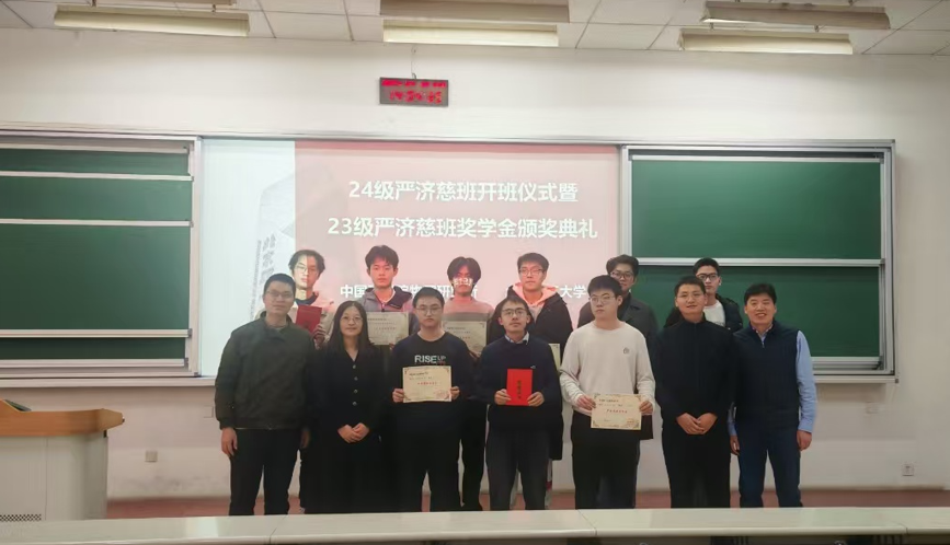 在面试选拔环节,共计33名2024级本科生报名参与,经过严格的专业课成绩排名和现场专业能力考察,最终共计29名同学通过选拔并顺利入选2024级“严济慈班”。选拔结束后,中国科学院物理研究所孔盼盼、陈辉、毛义元三位老师共同向2023级“严济慈班”中品学兼优、成绩优异的9名同学颁发“严济慈奖学金”,激励他们在后续的学习中继续深钻细研、笃学不怠。