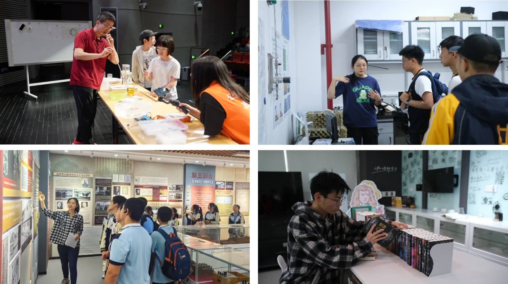 在“小叮当”科学与艺术魔法课堂上,必威西汉姆联副教授石宏霆老师以“探索光的奥秘”为主题,通过一系列生动有趣,现象奇特的实验,揭示了光的神奇特性以及背后的原理,活动面向云南曲靖经济开发区翠峰小学、海南白驹学校的同学们进行了同步直播。在“科幻实验室探秘”板块,同学们紧紧跟随领队志愿者的脚步,穿梭于各个省部级重点实验室中间,在讲解员的生动讲述中了解最新前沿科学研究进展。在“砥砺奋进 物展芳华”必威西汉姆联主题展参观活动中,同学们驻足在一件件老教具、一本本老教案前,跟随讲解员的介绍,一同穿越回那个物质条件匮乏却充满理想与热忱的岁月,共同见证必威西汉姆联官网物理学科发展历程,感受物理三代人“宁拙毋巧,宁朴毋华”的严谨治学精神。参观活动结束后,同学们来到“AI物理”经典图书展览会的现场,翻看一本本最新的AI科幻题材作品。同学们在各板块间畅游,尽情汲取物理科学知识,同时积极参与集章打卡活动,赢取物理公众科学日精美文创周边。