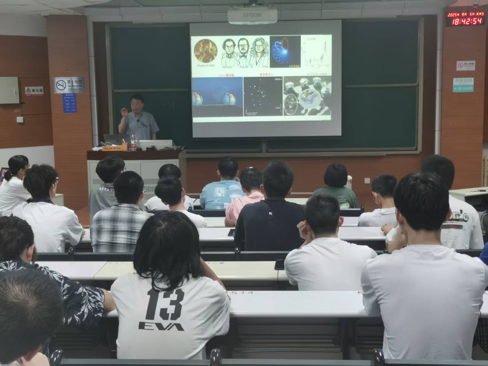 报告极大地激发了同学们对黑洞研究的兴趣。在提问环节,大家踊跃发言,提出了多个富有深度的问题,例如:“如何测量不同尺度黑洞的质量?”“太阳系内行星为何有些是固态、有些是气态?”“既然黑洞已被观测证实,白洞或虫洞是否可能存在?”以及“宇宙大爆炸之前的状态如何?”等。王建民研究员对这些问题一一作出细致解答,并鼓励同学们扎实掌握基础物理知识,为将来探索宇宙、投身科研奠定坚实基础。