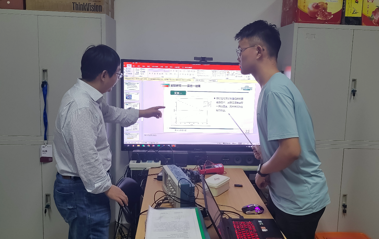 备赛阶段刘伟老师与队员姚柏合讨论赛题实验结果